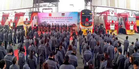 20161216日,中車戚墅堰公司56臺出口肯尼亞內(nèi)燃機(jī)車項目首批12臺交付??夏醽嗚F路公司、中國路橋工程有限責(zé)任公司、中車股份公司相關(guān)人士,共同為交付機(jī)車剪彩。