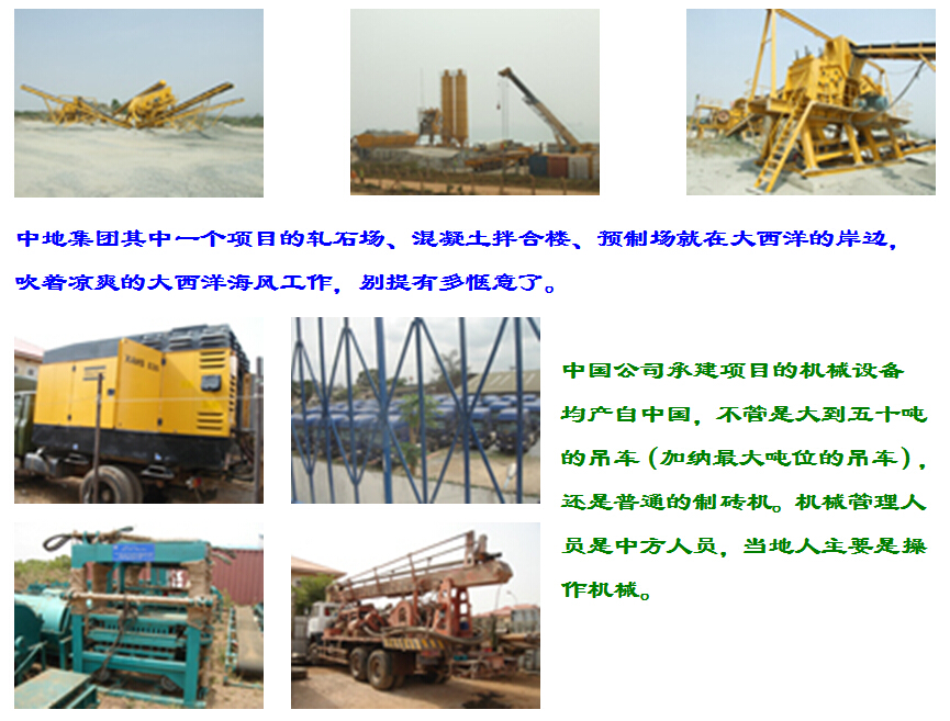 中地集團(tuán)其中一個(gè)項(xiàng)目的軋石場(chǎng)、混凝土拌合樓、預(yù)制場(chǎng)就在大西洋的岸邊,吹著涼爽的大西洋海風(fēng)工作,別提有多愜意了。中國(guó)公司承建項(xiàng)目的機(jī)械設(shè)備均產(chǎn)自中國(guó),不管是大到五十噸的吊車(加納最大噸位的吊車),還是普通的制磚機(jī)。機(jī)械管理人員是中方人員,當(dāng)?shù)厝酥饕遣僮鳈C(jī)械。