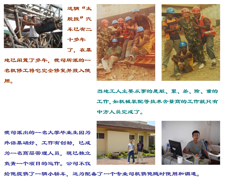 這輛“太脫拉”汽車已有二十多年了,在基地已閑置了多年,我司所派的一名機(jī)修工將它完全修復(fù)并投入使用。當(dāng)?shù)毓と酥饕獜氖碌氖桥K、累、差、險(xiǎn)、重的工作,如機(jī)械裝配等技術(shù)含量高的工作就只有中方人員完成了。我司派出的一名大學(xué)畢業(yè)生因?yàn)橥庹Z(yǔ)基礎(chǔ)好、工作有創(chuàng)勁,已成為一名高層管理人員,現(xiàn)已獨(dú)立負(fù)責(zé)一個(gè)項(xiàng)目的運(yùn)作。公司不僅給他提供了一輛小轎車,還為配備了一個(gè)專業(yè)司機(jī)供他隨時(shí)使用和調(diào)遣。我司人員在國(guó)外考察期間與派出人員在中地集團(tuán)加納項(xiàng)目經(jīng)理部基地合影。這些由我司派出的人員已成為中地集團(tuán)加納項(xiàng)目經(jīng)理部的中高層管理人員。