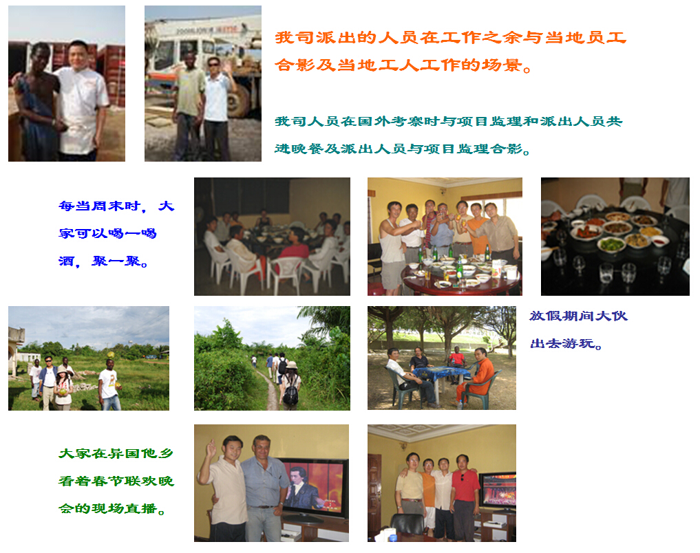 我司派出的人員在工作之余與當(dāng)?shù)貑T工合影及當(dāng)?shù)毓と斯ぷ鞯膱?chǎng)景。我司人員在國(guó)外考察時(shí)與項(xiàng)目監(jiān)理和派出人員共進(jìn)晚餐及派出人員與項(xiàng)目監(jiān)理合影。每當(dāng)周末時(shí),大家可以喝一喝酒,聚一聚。放假期間大伙出去游玩。