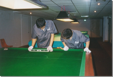 派往日本的臺(tái)球桌安裝工人以精湛的技術(shù)為客戶服務(wù)。